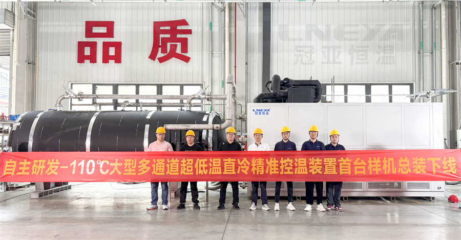 近日,冠亞恒溫車間舉行了自主研發(fā)-110℃多通道超低溫直冷機(jī)組首臺樣機(jī)總裝下線儀式。