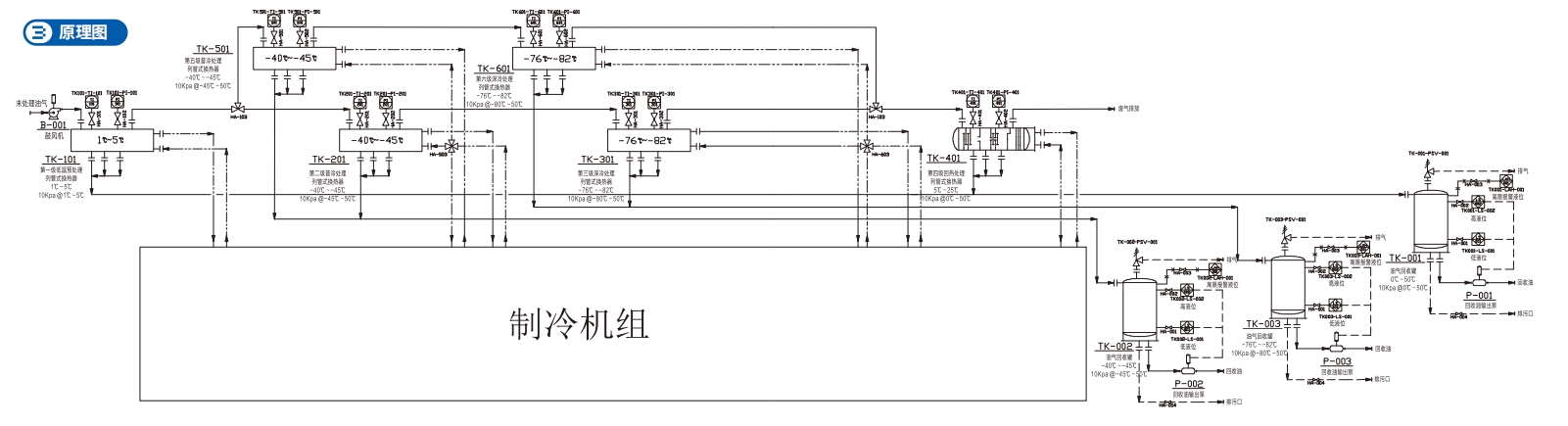 將揮發VOCs?體導?到設備冷箱(設置冷凝溫度 3℃? -40℃? -75℃? -115℃)可以定制其他溫度區,根據需求進?逐級冷凝液化。部分連續?產?藝在低溫段做雙路切換?藝(?側冰堵后,直接切換到另?路換熱冷箱冷凝,同時冰堵側做融霜處理)。